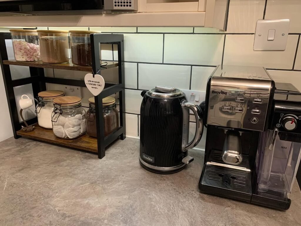 - Smart Vertical Storage: Using a two-tier shelving unit maximizes limited counter space, keeping sugar, coffee, and treats neatly stacked and visible.