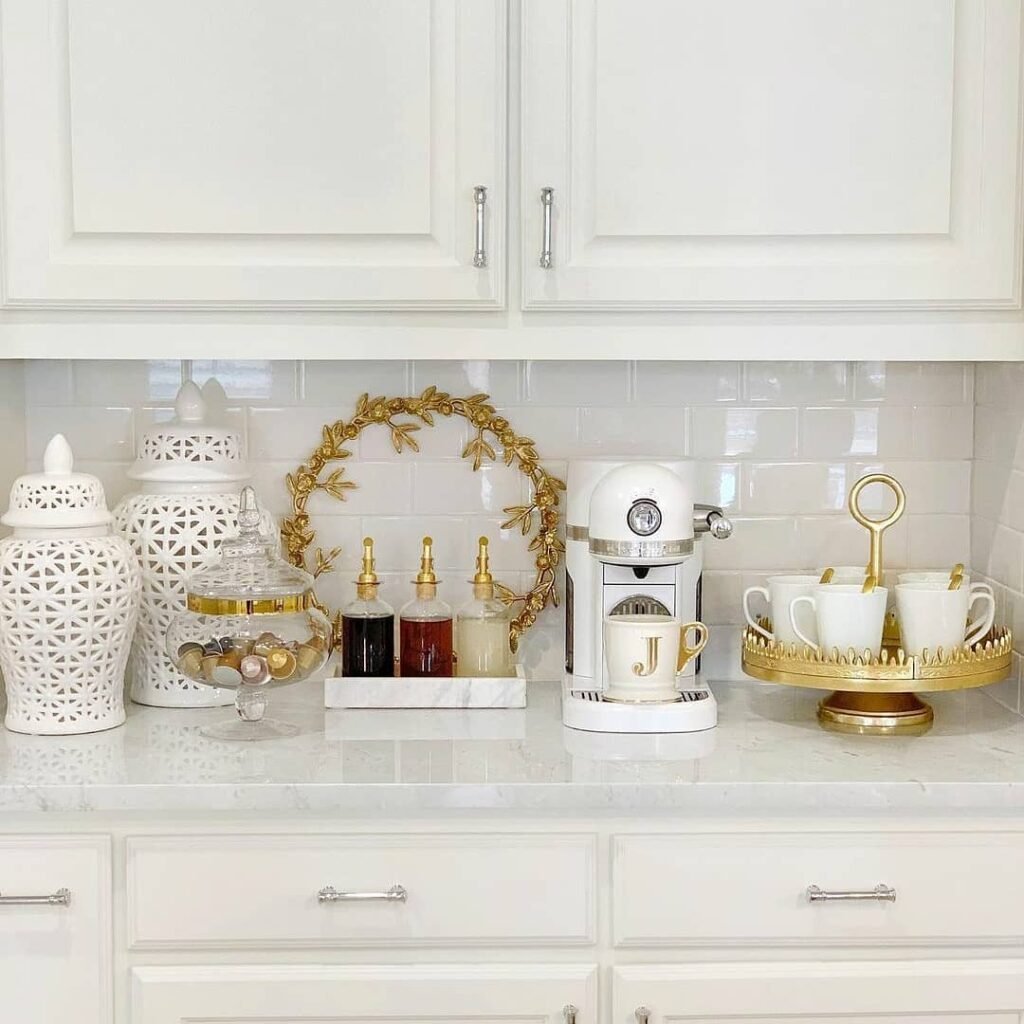 - Elevated Serving: Placing mugs on a gold-rimmed pedestal tray helps define the zone and keeps the cups organized without scattering them across the counter.