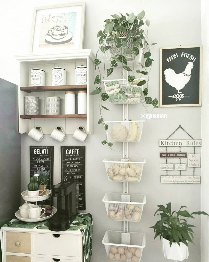 - Incorporating greenery, like that cascading pothos in the top basket, breathes life into the area and contrasts beautifully against the white metal and neutral tones of the cabinetry.
