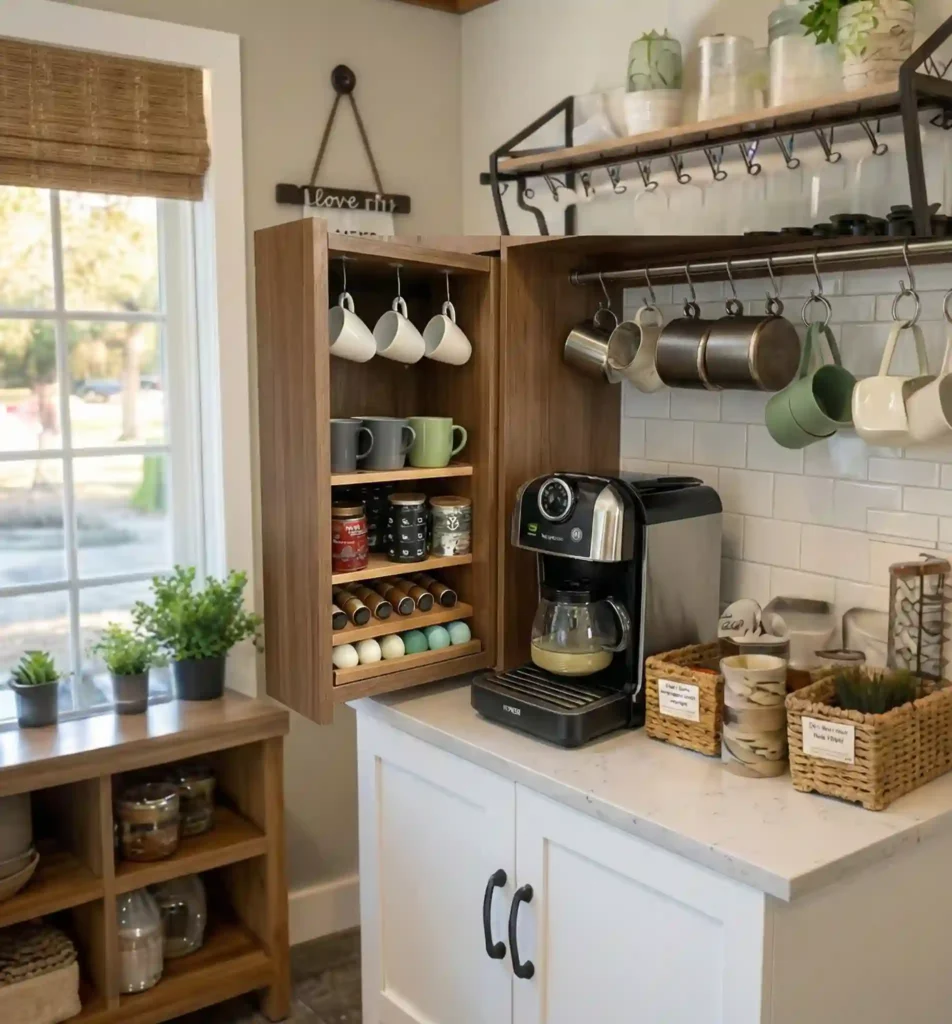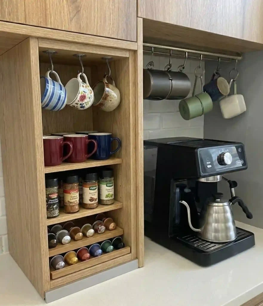 - Interior door shelves and hooks turn a standard cabinet face into a high-density storage wall, perfect for keeping color-coded pods and espresso cups organized.