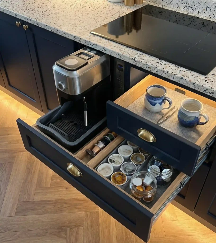 Building the coffee station directly into deep drawers offers a brilliant solution that keeps visual noise to zero when the unit is closed.