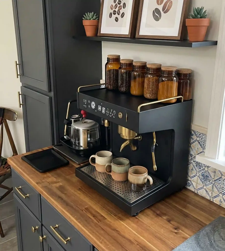Soft natural wood tones ground the space, making the daily ritual of brewing feel grounded and intentional.
