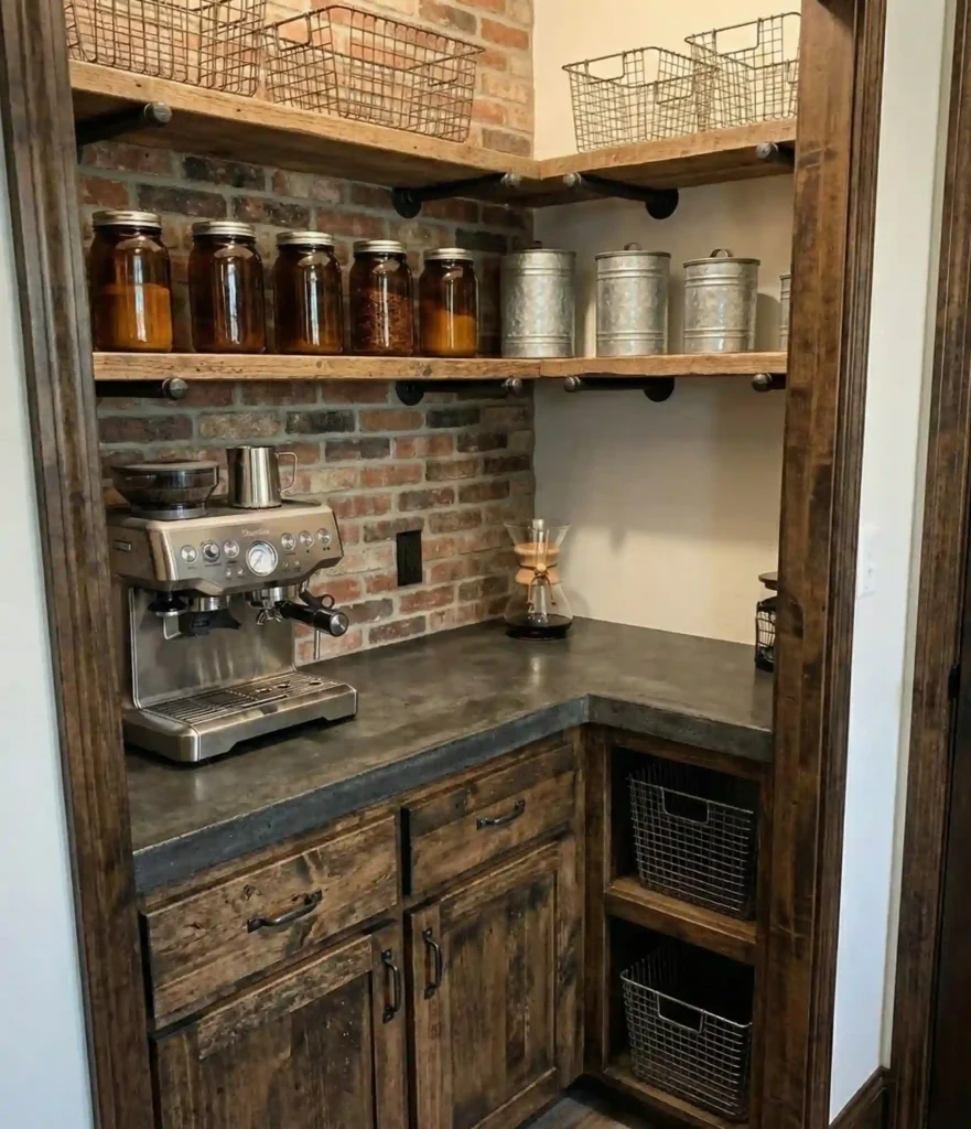 Converting a walk-in pantry into a dedicated beverage station allows you to embrace bold, raw textures that might feel too heavy for a main kitchen area.