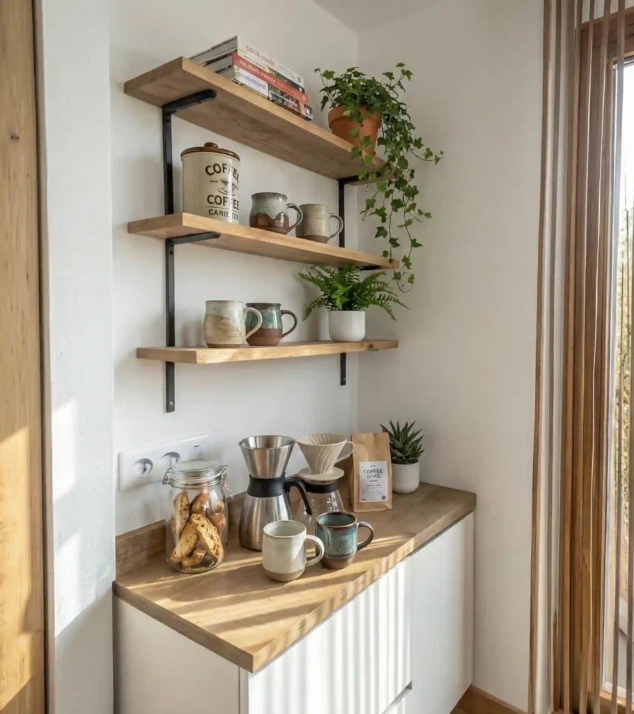 Utilizing vertical wall space with floating shelves keeps the small wooden countertop clear for brewing essentials like pour-over gear and carafe.