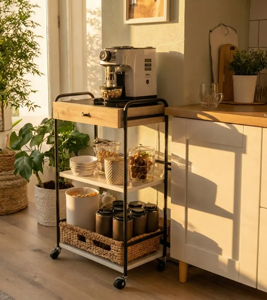A mobile cart like this one is a game-changer for smaller kitchens, offering a dedicated coffee spot that can be tucked away or rolled out as needed.