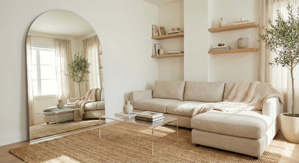 Placing a colossal arched floor mirror behind the sofa acts as a faux architectural feature, effectively doubling the visual depth by reflecting the window and the rest of the room.