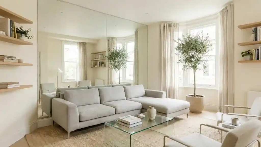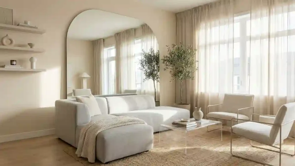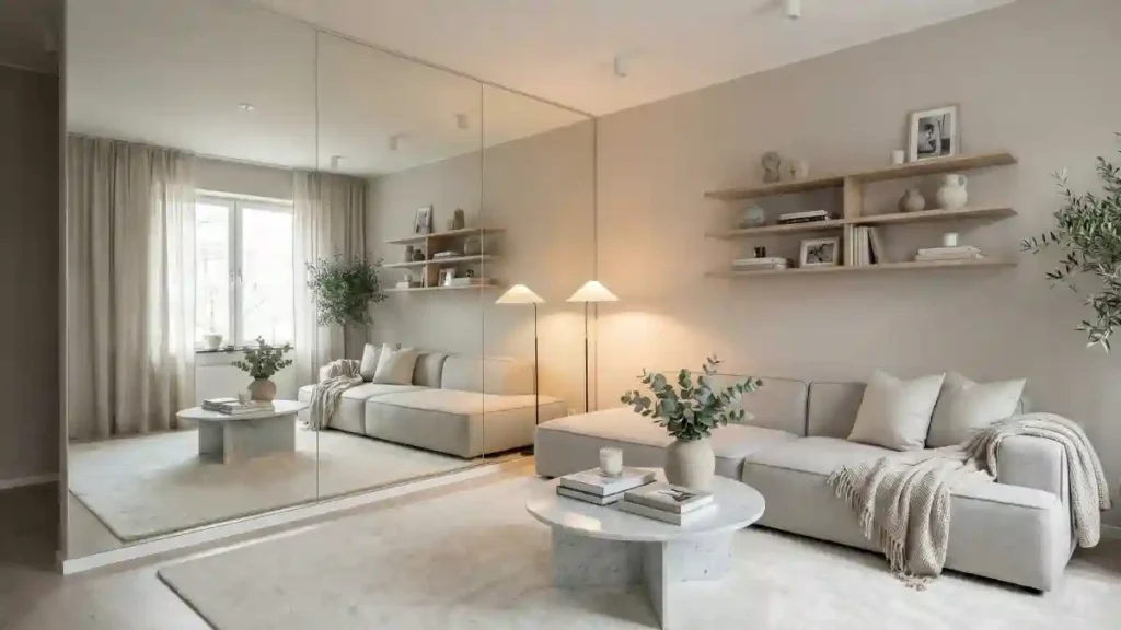 Soft beige tones act as a perfect canvas for stretching a room’s perceived limits, proving that neutral palettes are anything but dull. Strategically placing a massive gold mirror over the central seating area captures natural light from the adjacent window, effectively doubling the visual depth instantly.