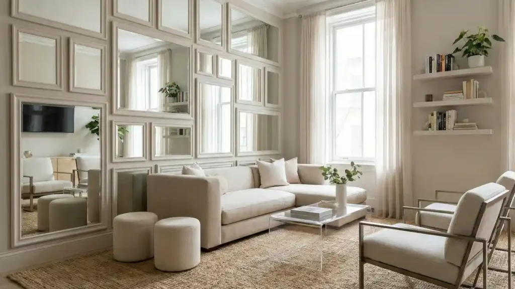 Installing a magnificent floor-to-ceiling grid mirror behind the light-colored sectional completely dissolves that solid wall, reflecting the window and making the room appear significantly deeper and brighter.