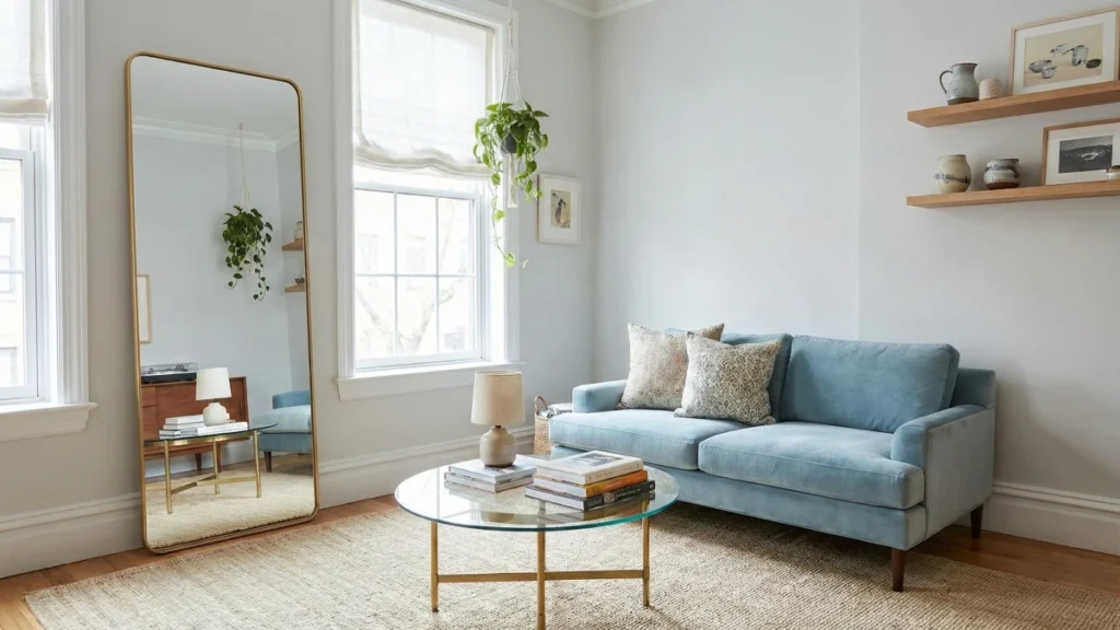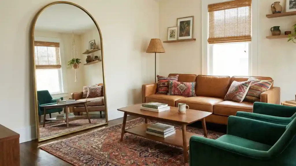 - Reflective Architecture: Leaning an oversized arched mirror against the main wall mimics a doorway to another room, tricking the brain into perceiving significantly more depth than actually exists.