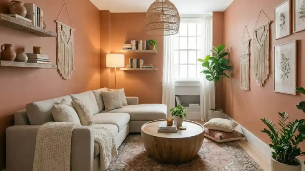 - Upward Gaze: Installing rustic floating shelves and hanging macrame art high on the walls forces the eye to travel upward, emphasizing vertical volume over limited floor square footage.
