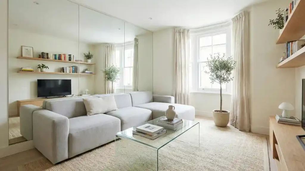 Wall-to-wall mirrors act as the ultimate architectural hack, dissolving the boundary behind the sofa to make the room feel infinite. Natural light floods in from the bay window and reflects instantly off the mirrored surface, brightening the entire space without needing extra lamps.