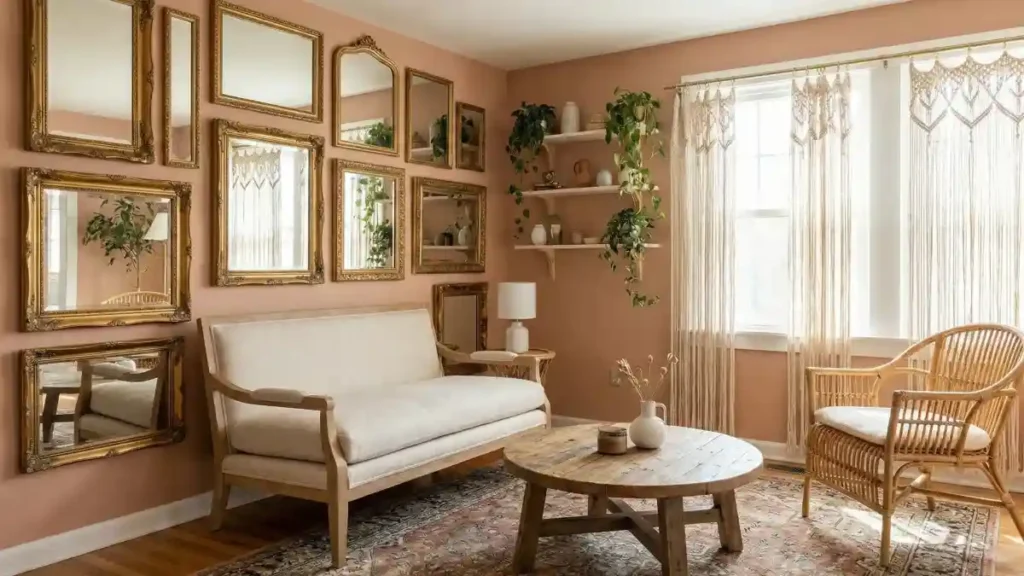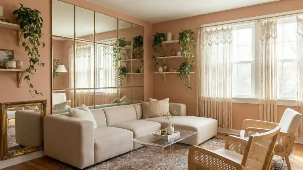 17. Boho Terracotta Lounge – Doubling Depth with a Floor-to-Ceiling Mirror Grid