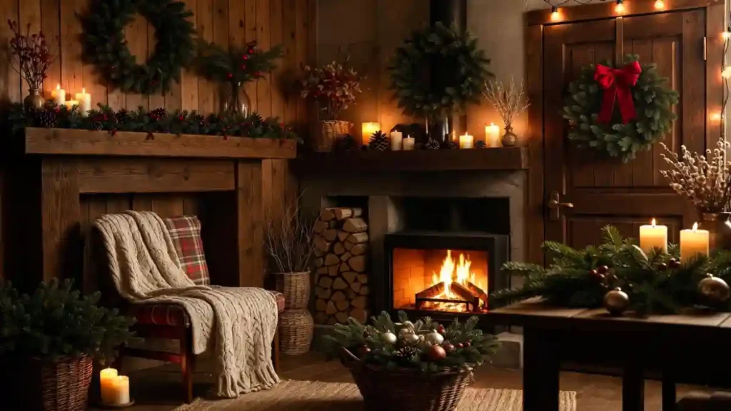3. Rustic Wood and Firelight Nook – A Cabin-Style Embrace for Snowy Days