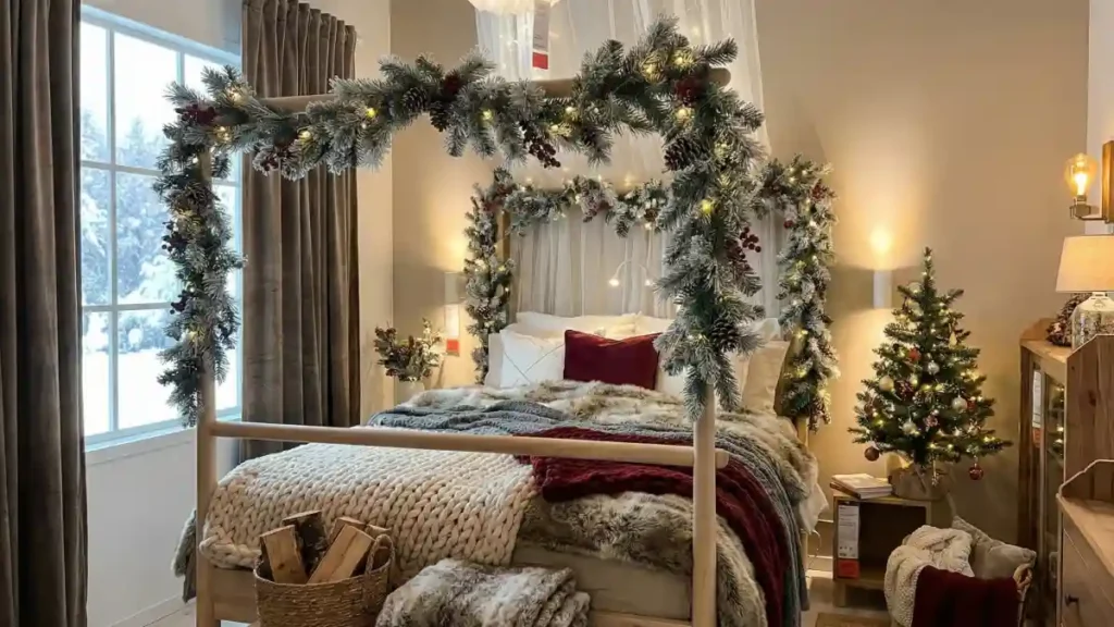 • Frame the view: Wrapping the upper beams of a canopy bed with heavy, flocked pine garland instantly lowers the visual ceiling, creating an intimate, den-like atmosphere that makes the room feel safely enclosed.