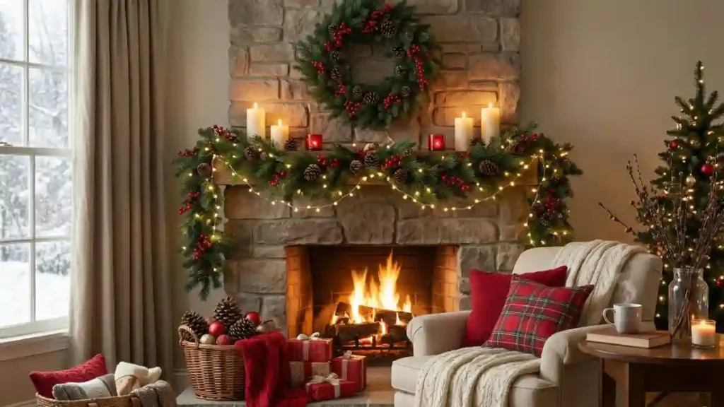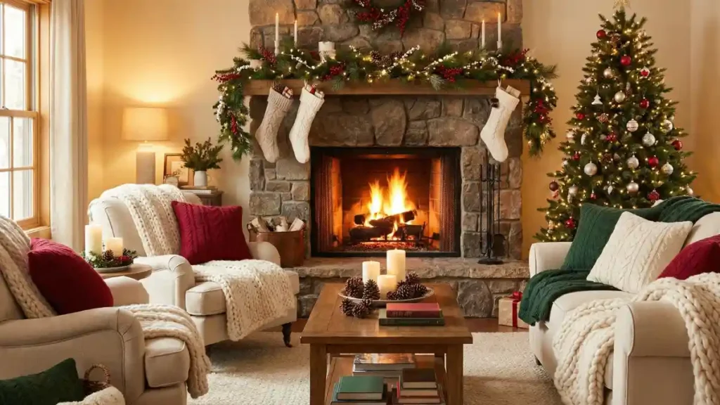 Stockings hung by the fireplace and a modestly decorated tree in the corner add layers of nostalgia without cluttering the walking paths, ensuring the space remains functional yet undeniably festive.