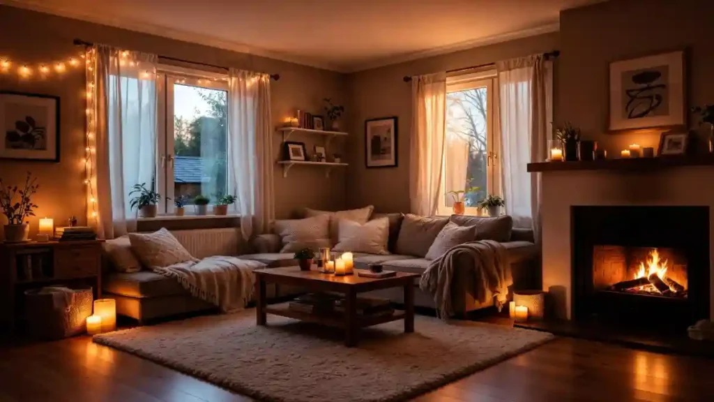 2. Amber-Lit Hygge Living Room – A Glowing Sanctuary for Long Winter Nights