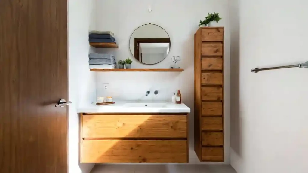 Nature-inspired decor meets smart organization in this setup, where warm wood tones break up the sterility of white tiles to create a calming, organic atmosphere.