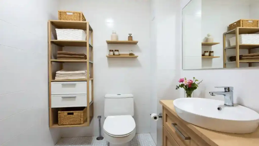 Simple, light-wood open shelving creates an airy display zone that keeps essentials accessible without crowding the room, perfectly complementing the beige walls and white fixtures.