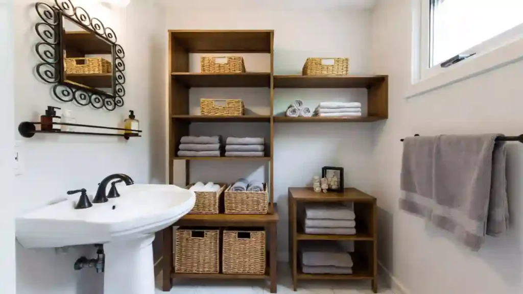 This setup embraces open storage, turning stacks of grey towels and textured wicker baskets into a cohesive design statement rather than just clutter management.