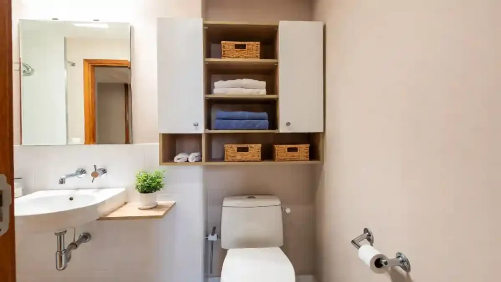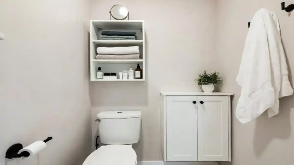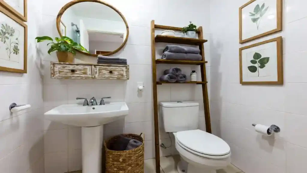 Install floating shelves or over-the-toilet ladders to utilize empty wall real estate.