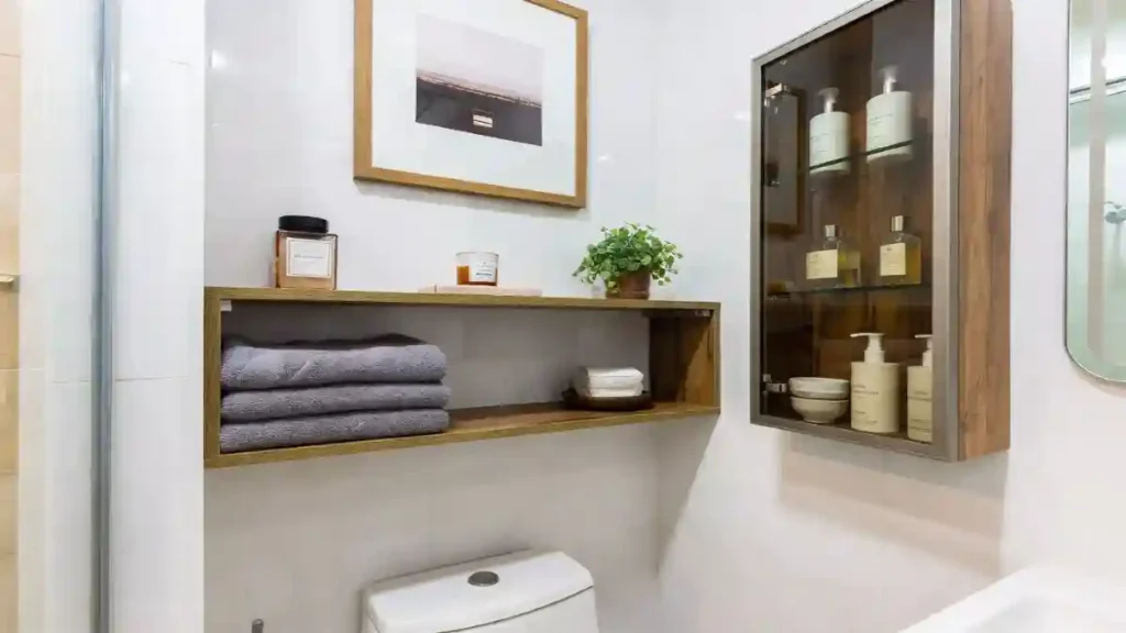 - Spanning the width above the commode, a sleek wooden box frame creates a dedicated zone for fresh linens, keeping them within arm’s reach while adding a horizontal line that visually widens the narrow room.
