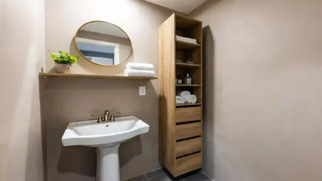 - Low-profile bins tucked under the sink rim solve the “no cabinet” dilemma common with pedestals, providing a discreet stash spot for extra rolls that stays accessible yet unobtrusive.