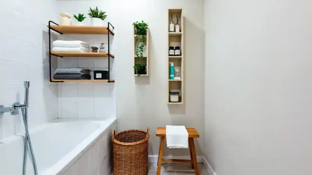 Introducing a simple, multi-tiered wooden shelving unit adds a necessary dose of organic warmth to the otherwise stark white tiled environment, transforming a utilitarian corner into a functional display.