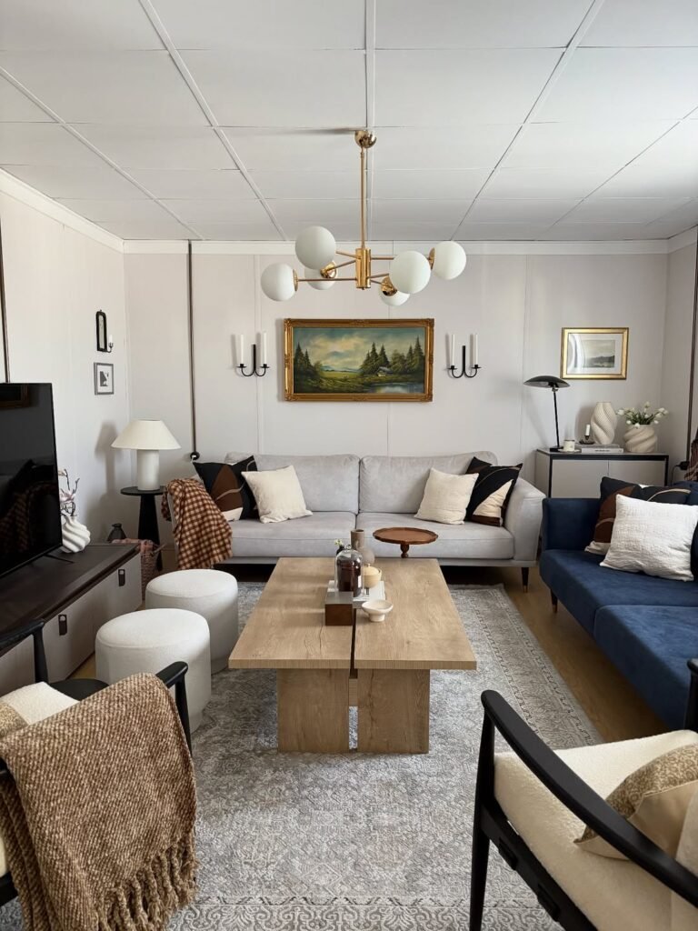 - Mixed Lighting: The combination of a modern industrial chandelier and a sleek floor lamp ensures the space remains well-lit and welcoming despite the deeper color scheme.