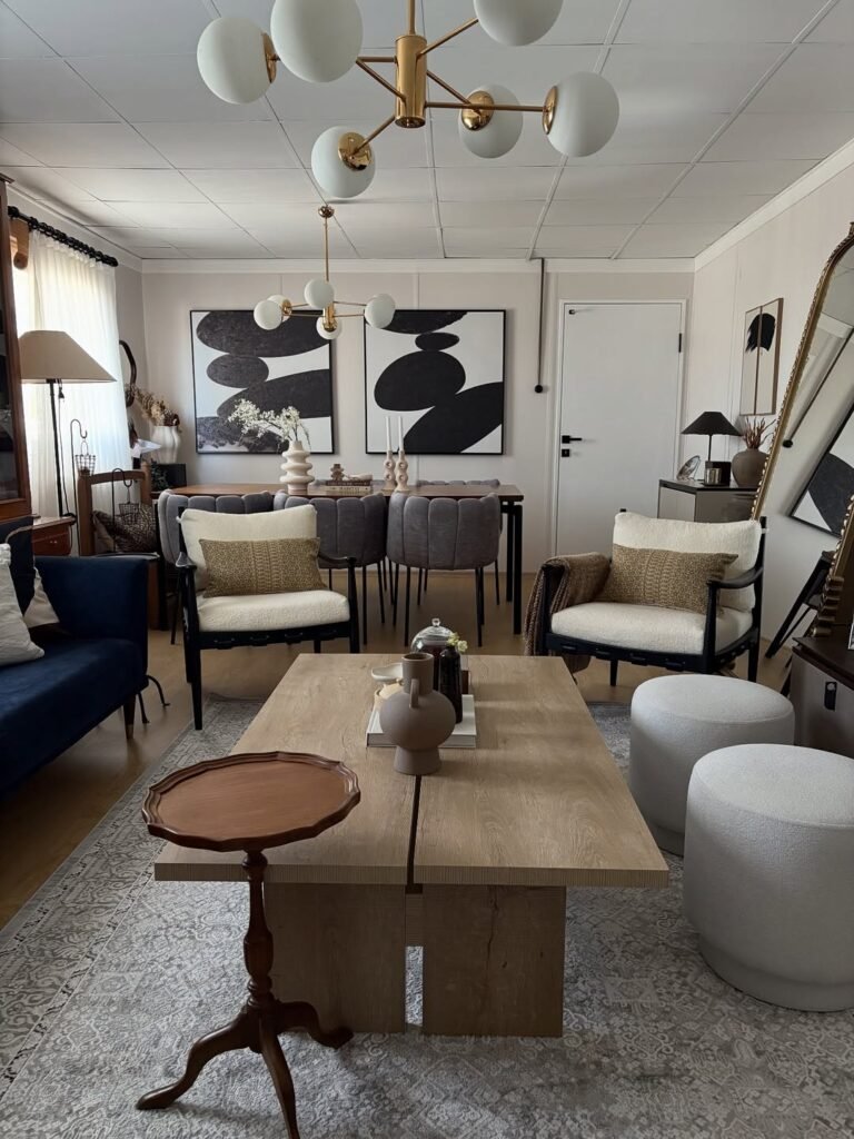 - Sculptural Lighting: Globe lighting in brushed gold offers a sculptural, retro-modern pop that feels surprisingly at home hovering above the raw, blocky wood coffee table.