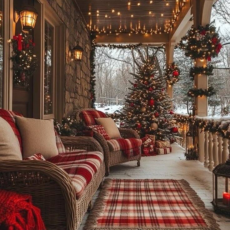 Red tartan patterns dominate the textiles, instantly signaling the holiday season and offering a vibrant counterpoint to the snowy white landscape beyond the railing.