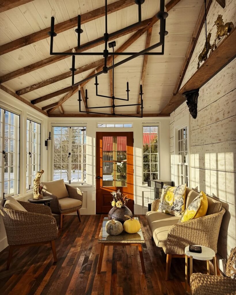 Sunlight dances across the varied wood tones in this enclosed porch, creating a golden hour glow that lasts all day.