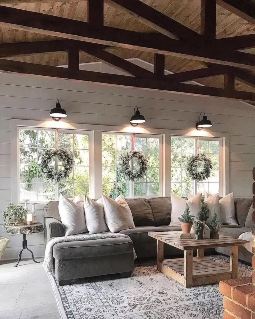 - Raw Materials: Using a pallet-style coffee table reinforces the humble origins of farmhouse design, offering a raw wood surface that welcomes feet and hot cocoa mugs alike.