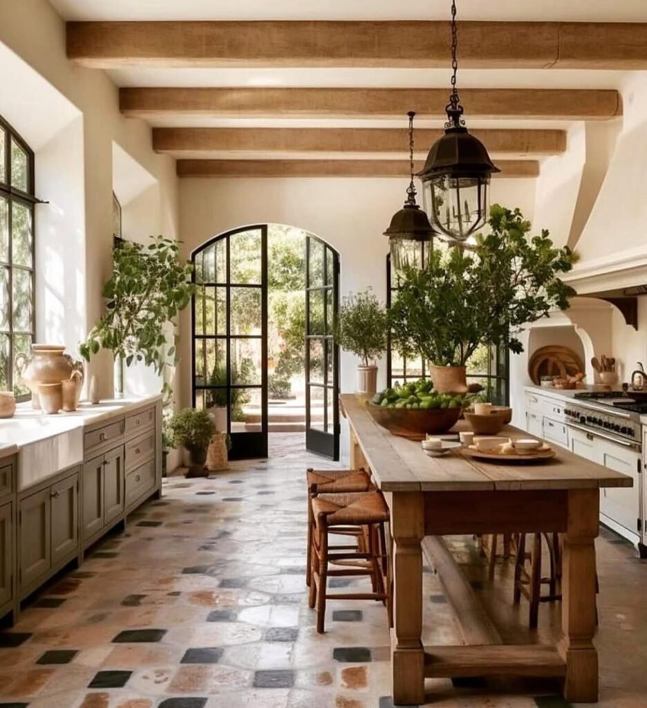 - Open Flow: Using a narrow, antique trestle table instead of a bulky built-in island keeps the traffic flow open and airy, prioritizing social connection over storage density.