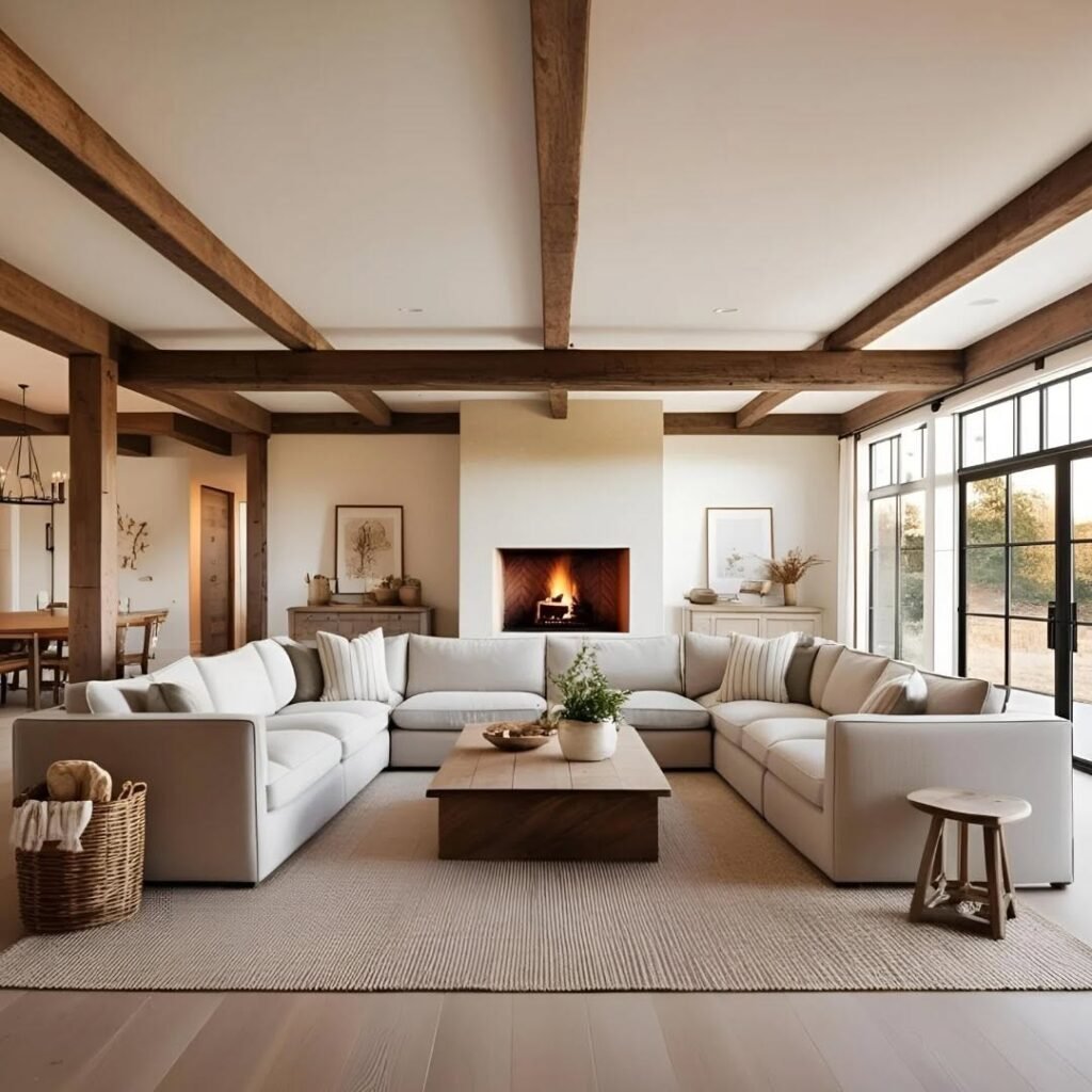 Rough-hewn beams stretch across the ceiling, their rugged texture grounding the sleek, creamy white finishes of the island and range hood for a look that feels both curated and lived-in.