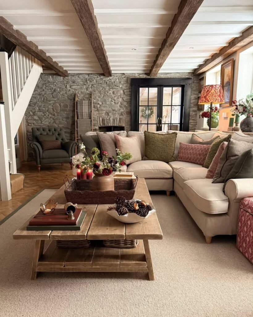 - Architectural Intimacy: Dark timber beams traverse the low ceiling, enhancing the intimate, cottage-like scale while reinforcing the room’s rustic architectural bones.