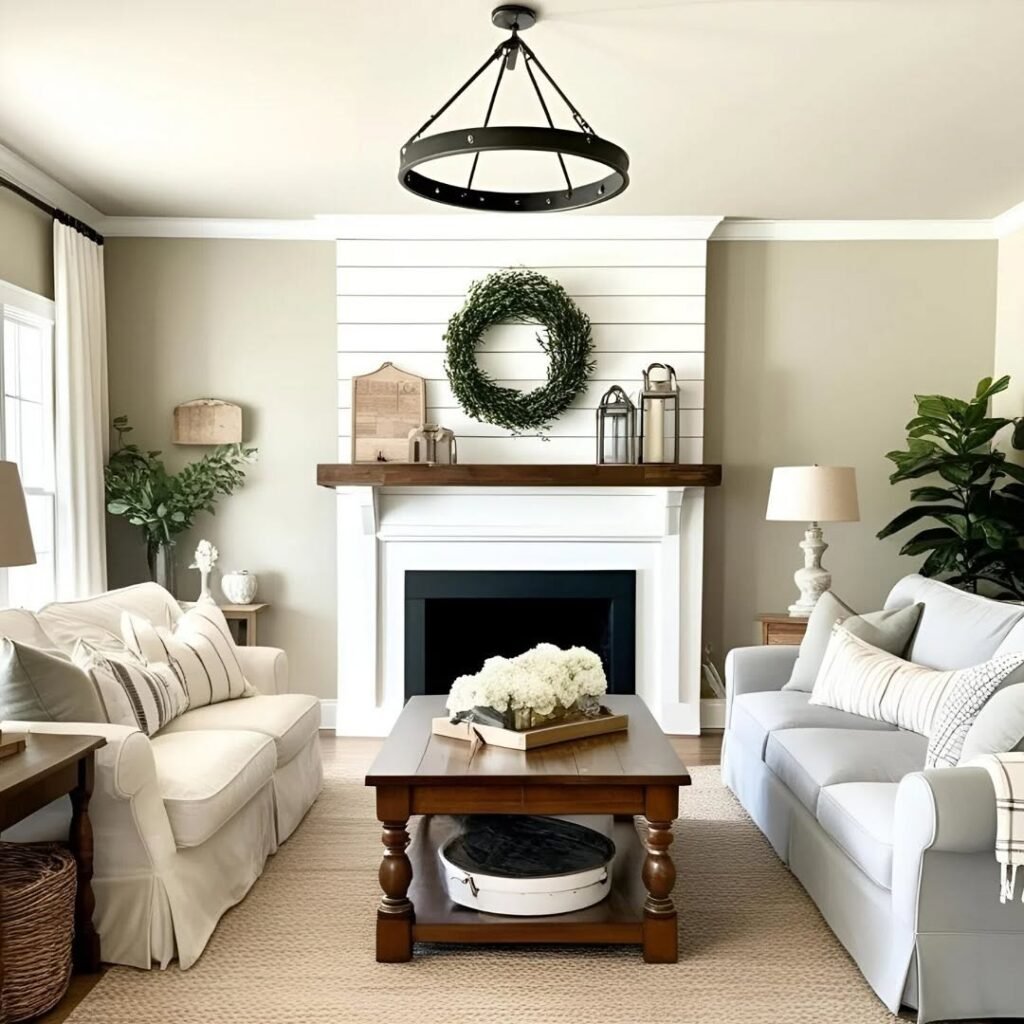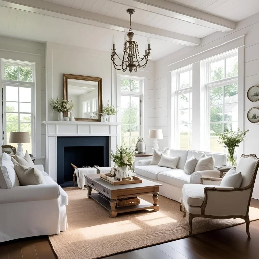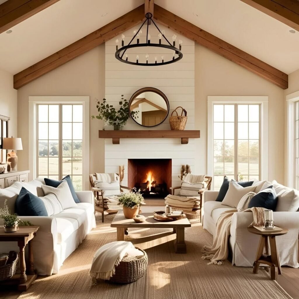 - Matte black iron accents in the circular chandelier and fireplace insert introduce a modern industrial edge that contrasts beautifully with the soft textiles.