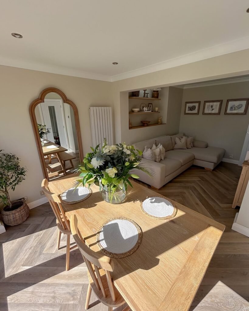 - Statement Reflection: An oversized, arched wood-framed mirror leans casually against the wall, visually doubling the dining area and bouncing sunlight deep into the room.