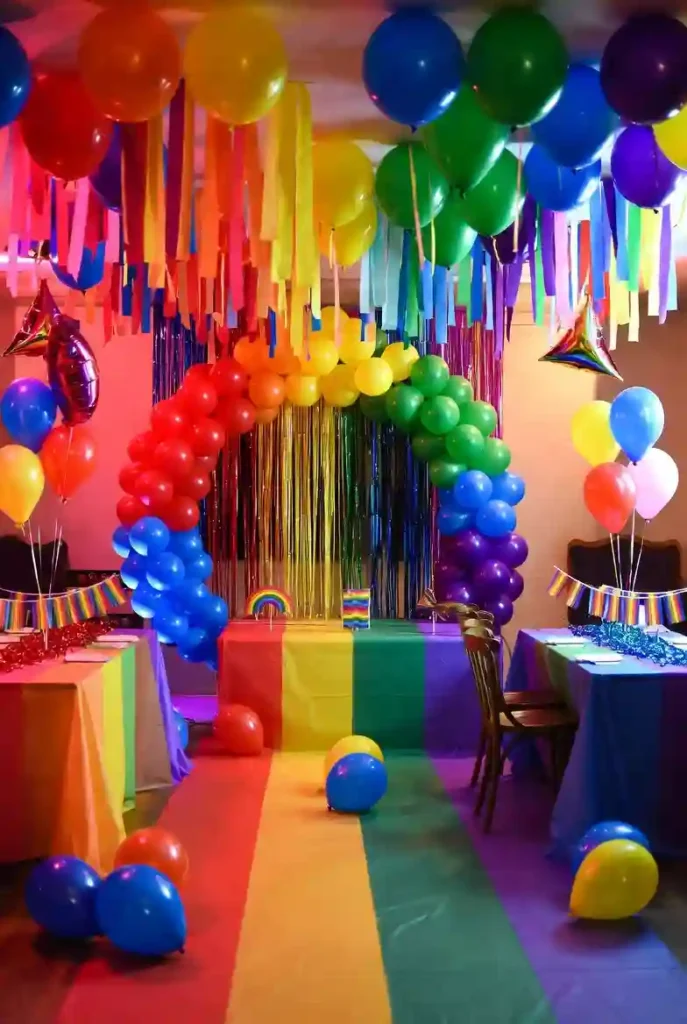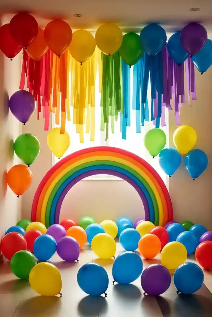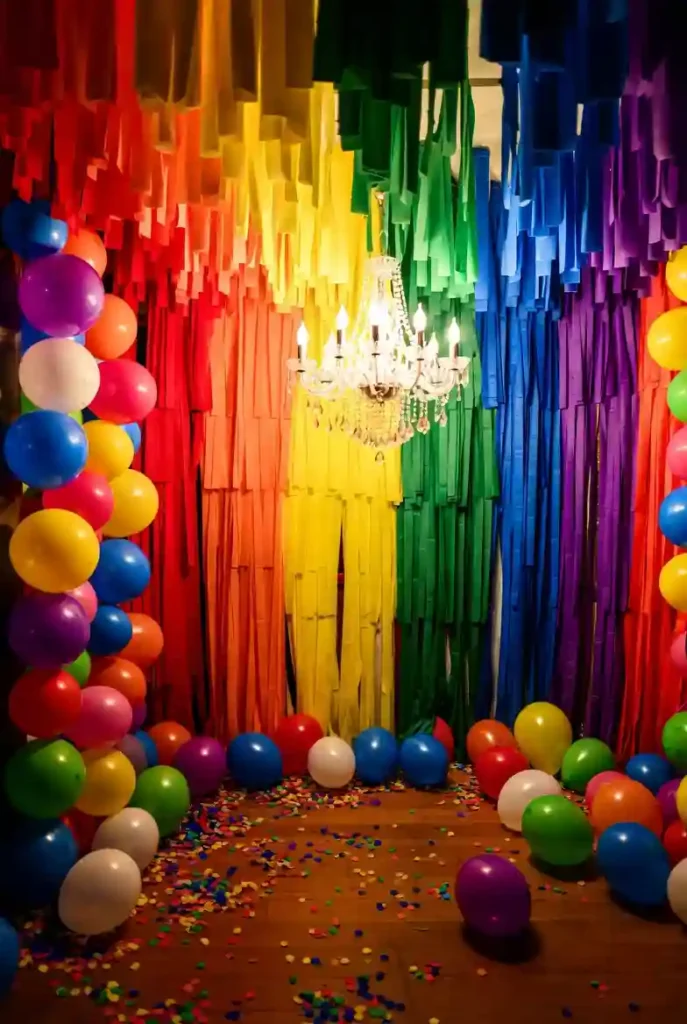 - Scatter confetti and loose balloons on the floor to mimic the effect of color “raining” down, ensuring the theme touches every level of the room.