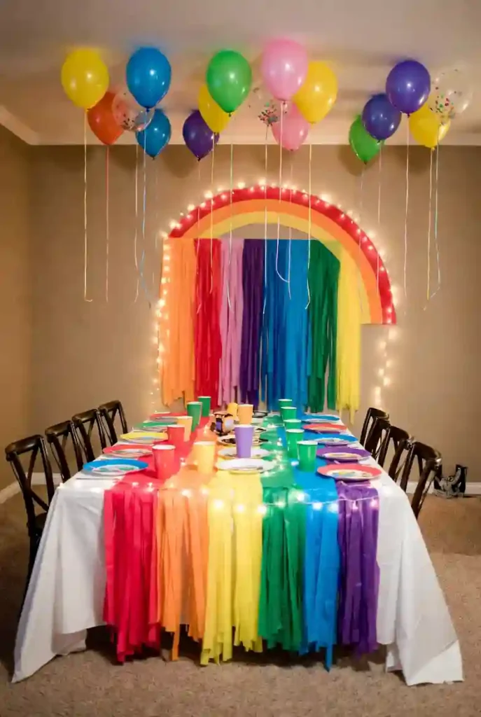 - Run a cascade of rainbow streamers down the center and over the edge of the table, illuminating them with string lights to add a magical glow to the setting.