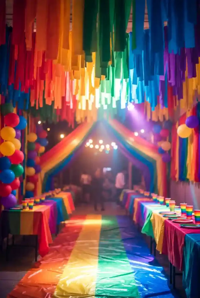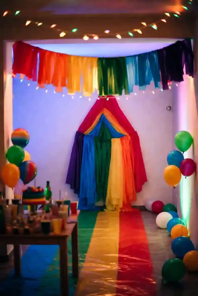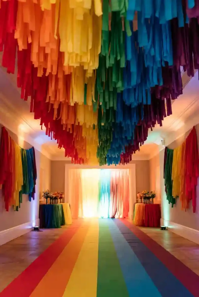 - Construct a dramatic fabric tunnel entrance using draped materials in rainbow order to physically transition guests from the ordinary world into your colorful reality.
