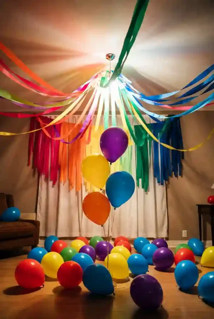 - Create a “false ceiling” of color by suspending vertical streamers and loose balloons, effectively lowering the room’s height for a cosier, more intense party vibe.