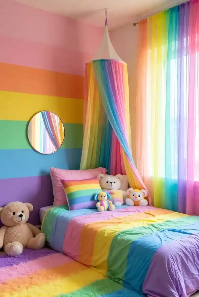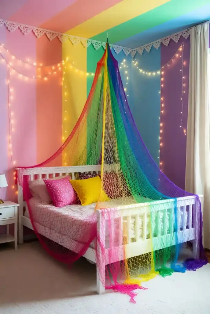 - Create a cozy, enclosed feeling without blocking out the light by draping a sheer, rainbow-colored net from the ceiling, instantly turning a standard bed into a magical fortress.