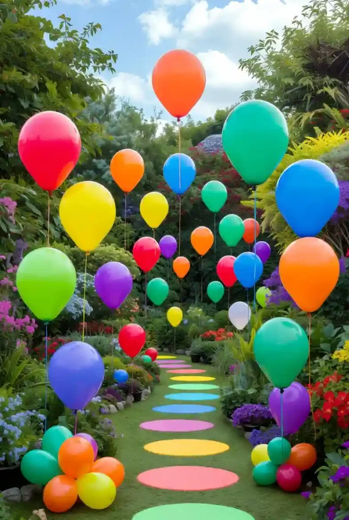 Floating balloons tied along the route add a sense of wonder and vertical interest, making the entire garden feel alive with color.