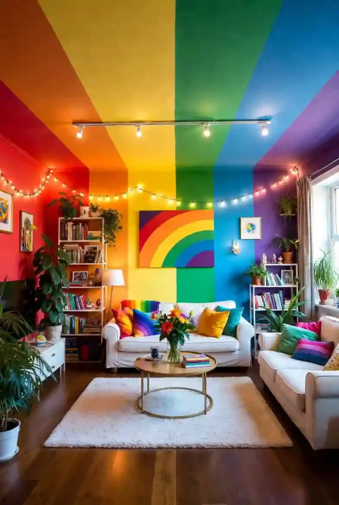 - Carry the rainbow stripes across the ceiling and down the central wall to create a seamless visual flow that envelops the seating area.