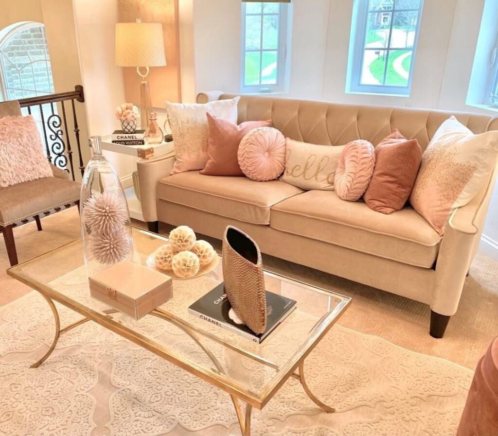 Repeating the soft pinks from the sofa onto the table connects the whole look, proving that intentional coordination replaces the need for pricey centerpieces.