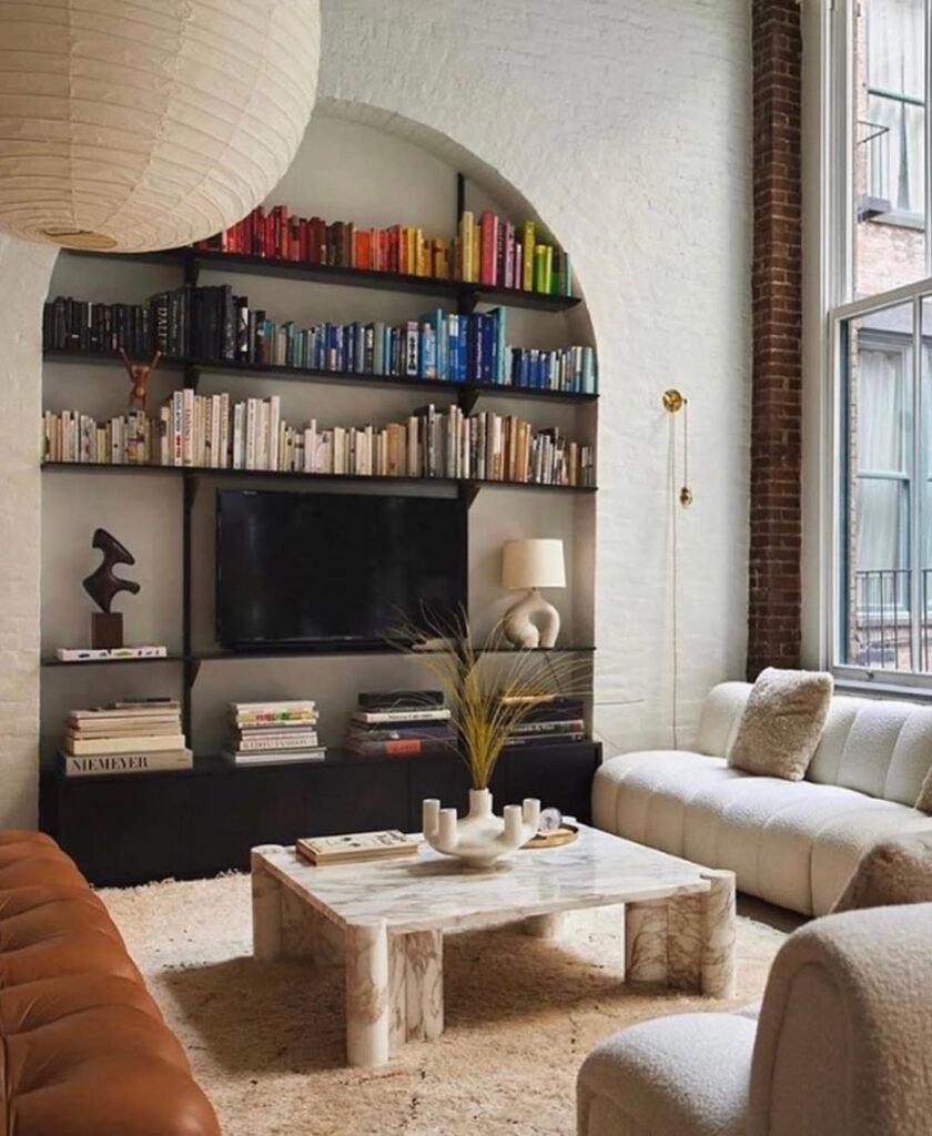 - Keep literature low: Tall stacks would look messy here. Laying just one or two art books flat ensures the view of the TV and that incredible book collection remains unobstructed, keeping the vibe relaxed rather than studious.