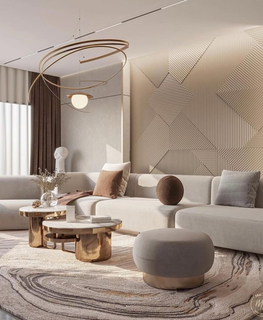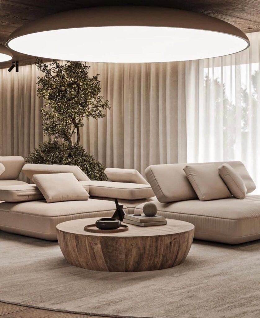 - Echo the silhouette: Sharp angles would look harsh here. Choosing a table with curved, cylindrical bases perfectly mimics the rounded edges of the sofa and ottomans, creating a soft, continuous flow that feels incredibly expensive.
