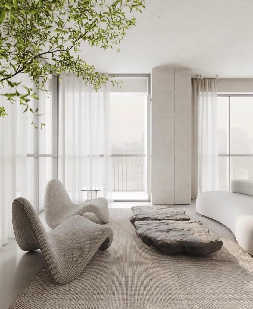- Surround with extreme softness: Pairing the hard, cold stone with plush, woven chairs and sheer floor-to-ceiling curtains creates a tactile conflict that elevates the room, making the raw material feel deliberate and sophisticated.