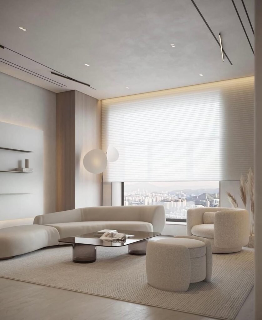 You probably worry that a see-through surface lacks the visual weight to anchor a room full of plush, cream furniture, but the goal here is “quiet luxury” where the floor plan feels uninterrupted.