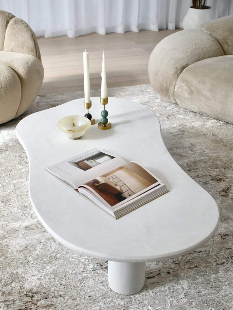 - Respect the negative space: Clutter destroys the sleek silhouette of an organic table shape. Placing just three distinct items—a wooden bowl, a tiny vase, and a book—creates a triad that feels complete without hiding the table’s unique form.